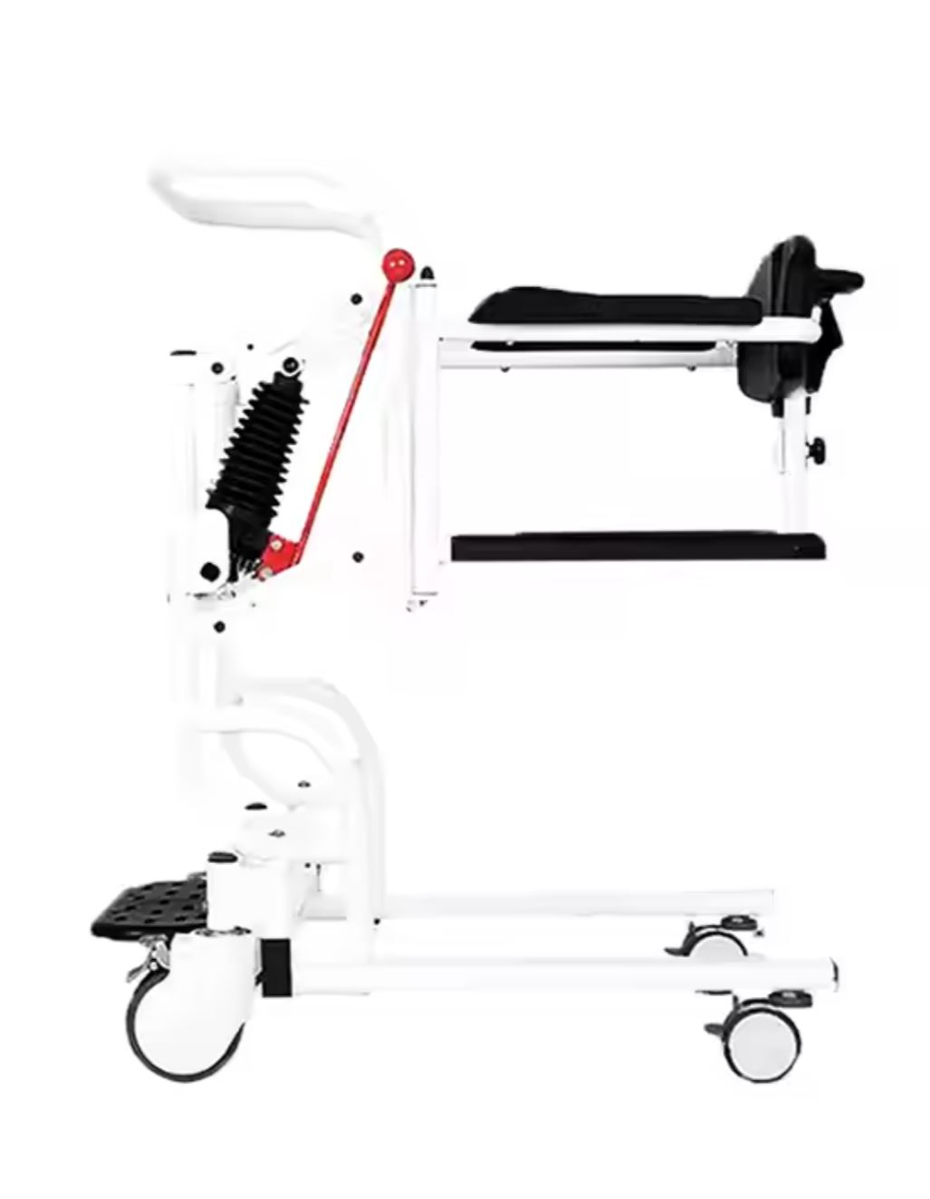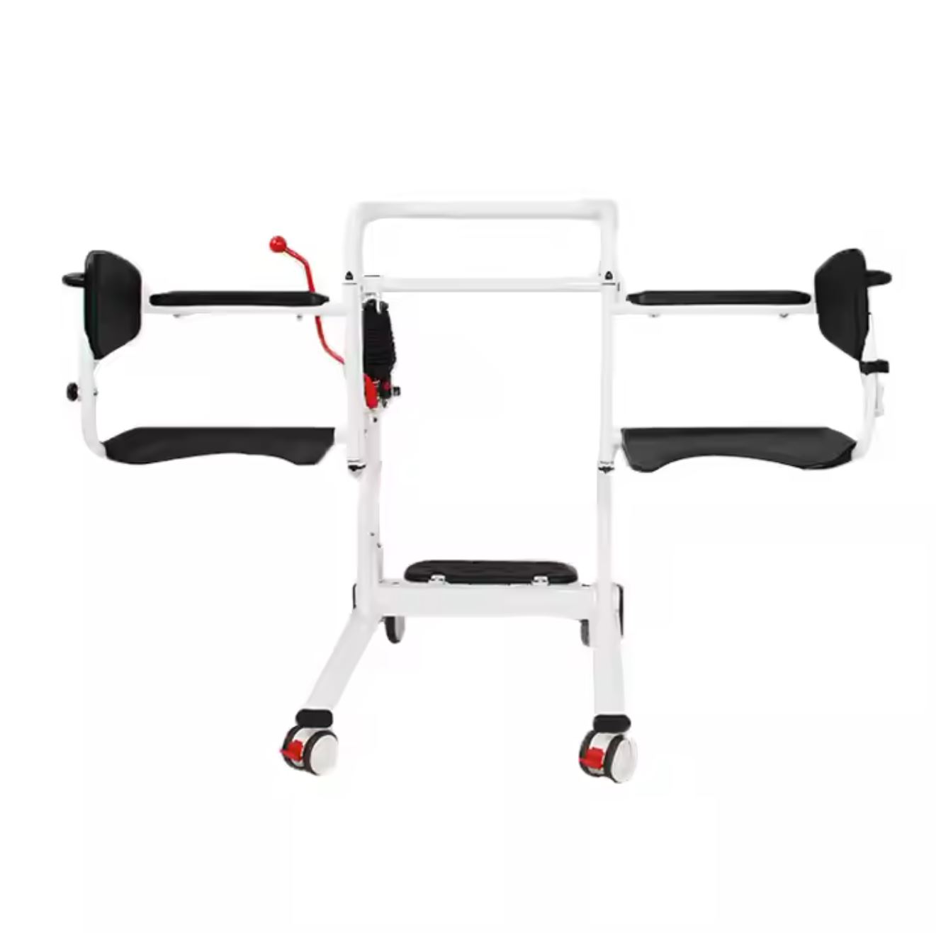 In order to ensure the transfer chair can match different heights, the lift system’s height can be adjusted from 46 to 66 cm. The chair overall width is 62cm can easy access the door. The patient will have a back support with a pelvic belt, which adds support for a safe posture.